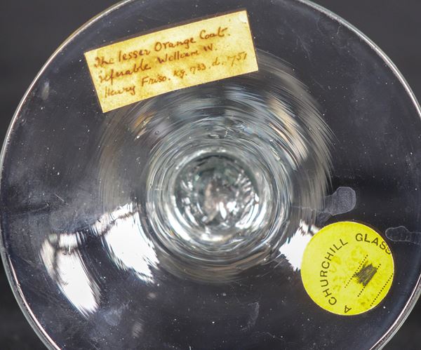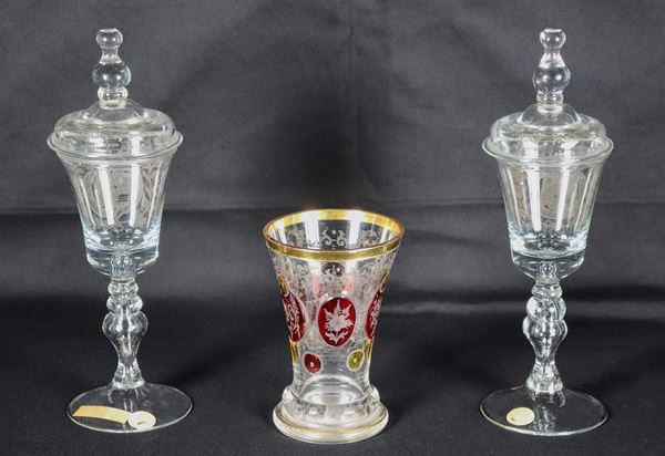 Antico lotto di una coppia di bicchieri inglesi con coperchio, in vetro inciso con stemma di Re William IV e un bicchiere in cristallo di Boemia, [..]