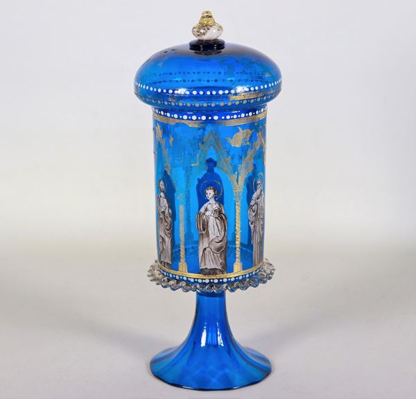Calice con coperchio in vetro soffiato di Murano azzurro, con applicazioni dorate e in smalto con figure di "Santi". Lieve difetto al bordo [..]