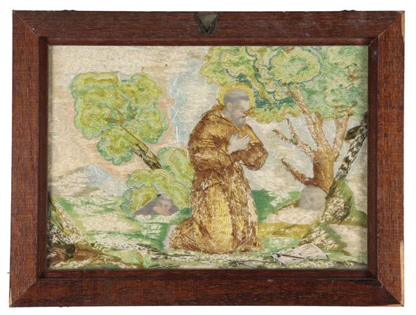 "San Francesco", dipinto su ricamo a fili di seta incollati