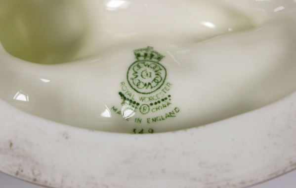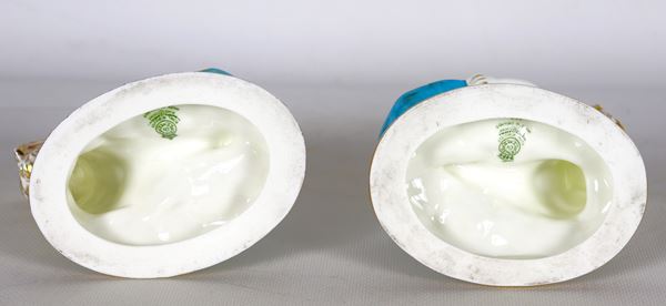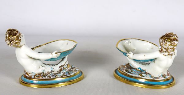 "Giovani tritoni con conchiglie", coppia di saliere in porcellana inglese policroma di Royal Worcester