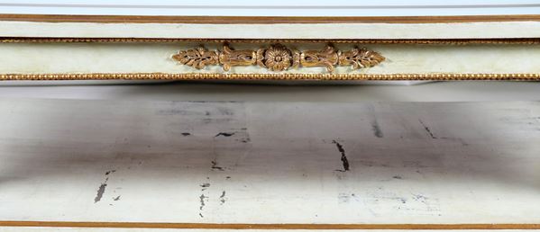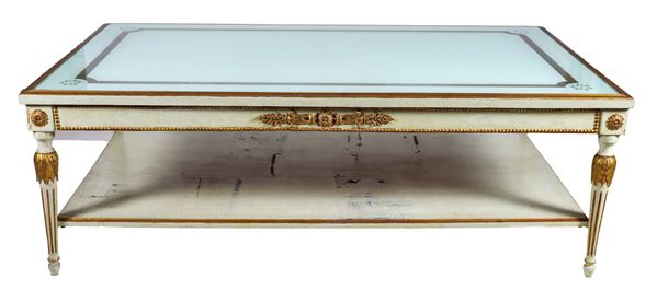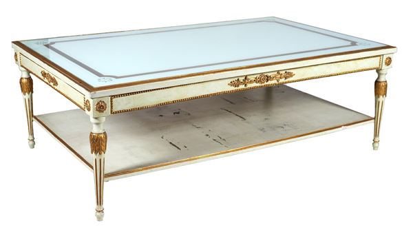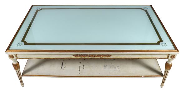 Grande tavolo da salotto francese, in legno laccato e dorato con intagli a motivi Luigi XVI, piano in vetro decorato