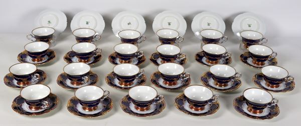 Lotto di ventitré tazzine in porcellana Bavaria blu cobalto, con decorazioni a rilievo a volute in oro zecchino. Manifattura Inizio XX Secolo [..]
