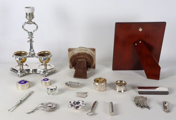 cornice portafoto, scatoline, bicchierino, portatovaglioli, passini, piccolo orologio e un'oliera trasformata a lume mancante delle ampolle, con due ciotoline in metallo adattate. Difetti e rotture, misura massima cm 22 x 13 x 30 h.