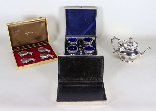 Lotto in sheffield sbalzato e cesellato di una teiera vittoriana, una scatola portasigarette, quattro posacenere a forma di pesce e quattro [..]