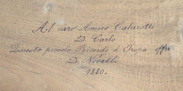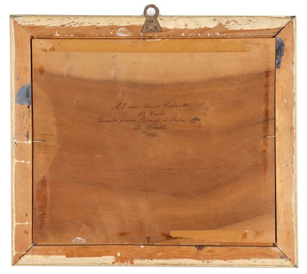 Firmato e datato sul retro 1880. "Ricordo di Oropa", piccolo dipinto ad olio su tavoletta