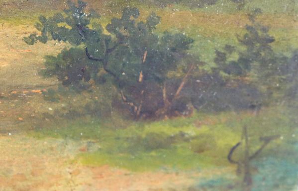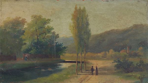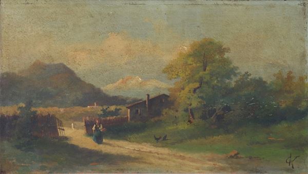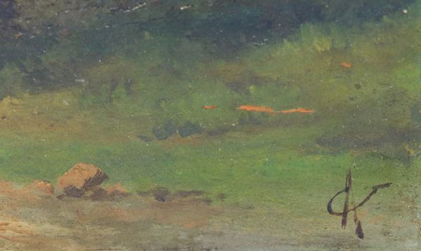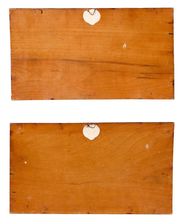 Siglati. "Paesaggi con contadini", coppia di piccoli dipinti ad olio su tavoletta