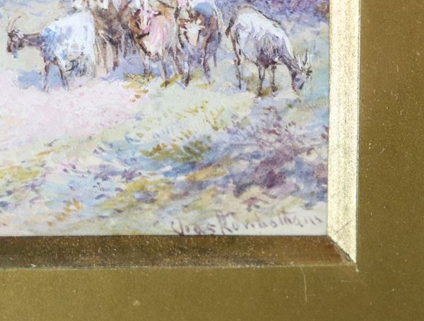 Firmato. "Paesaggio sopra Scilla con pastorelle e gregge di caprette", luminoso piccolo dipinto ad olio magro