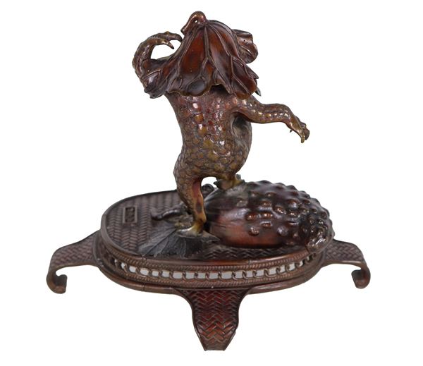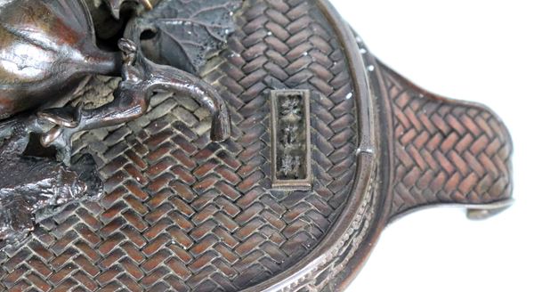 "Scimmietta con casco di banane", antico piccolo gruppo giapponese in bronzo. Firmato