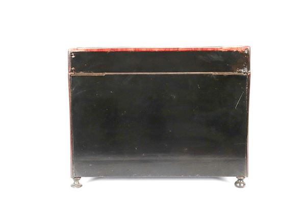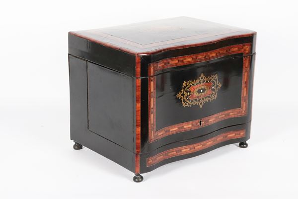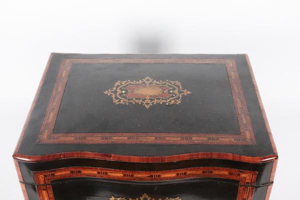Antica scatola francese da viaggio per bottiglie e bicchierini da liquore, in legno ebanizzato, bois de rose ed ebano viola, guarnizioni in [..]