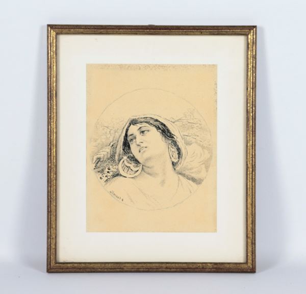 Firmato. "Ritratto di giovane popolana abruzzese", litografia su carta in cornice dorata e passepartout