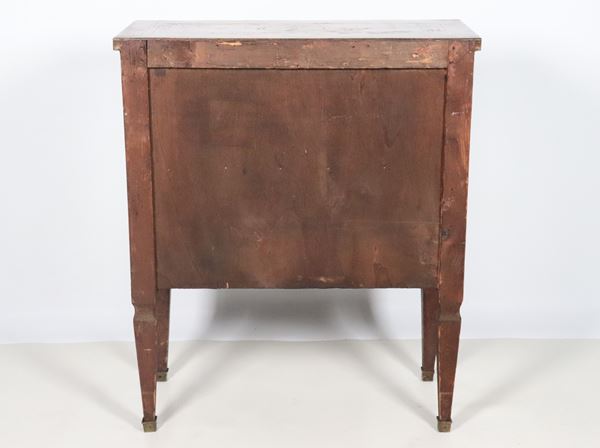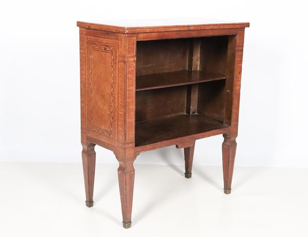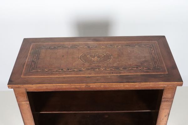 Comodino napoletano in noce con intarsi a filettature e volute floreali, frontale a giorno con pianetto e quattro gambe a tronco di piramide [..]
