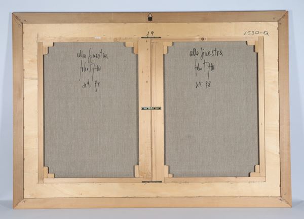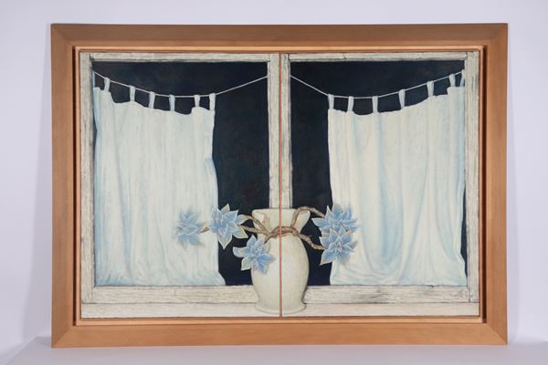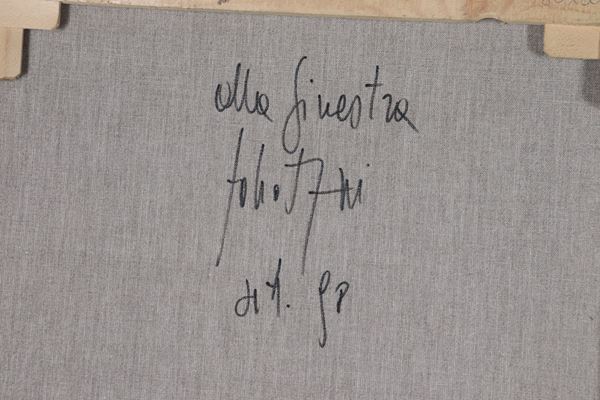 "Alla finestra", dipinto ad olio su tela, firmato e datato sul retro della tela, cornice in legno decapè