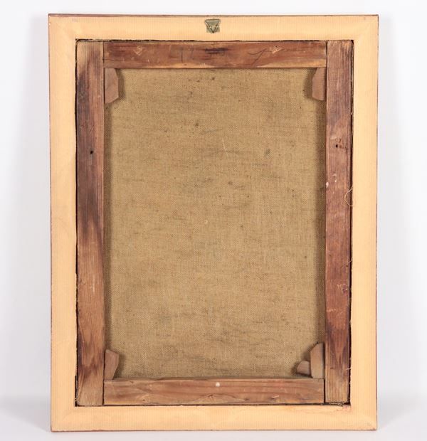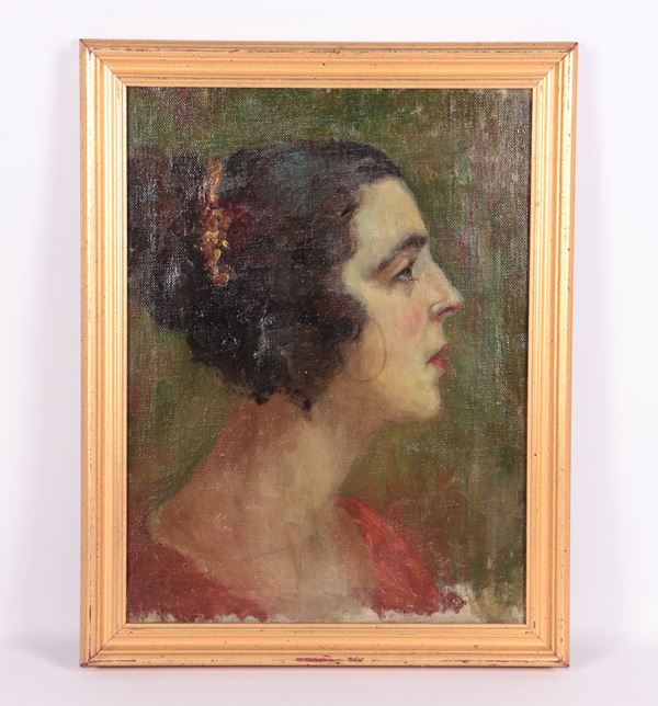 "Ritratto di volto femminile", piccolo dipinto ad olio su tela in cornice in legno dorato