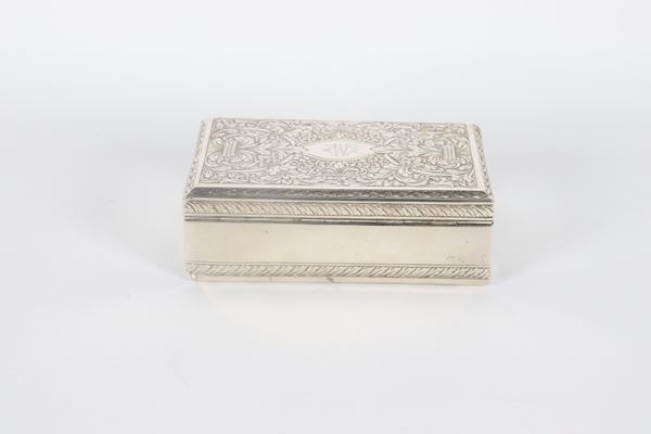 Scatola portasigarette in argento e legno a forma rettangolare, cesellata e sbalzata a motivi di intrecci di volute floreali e monogramma sul [..]