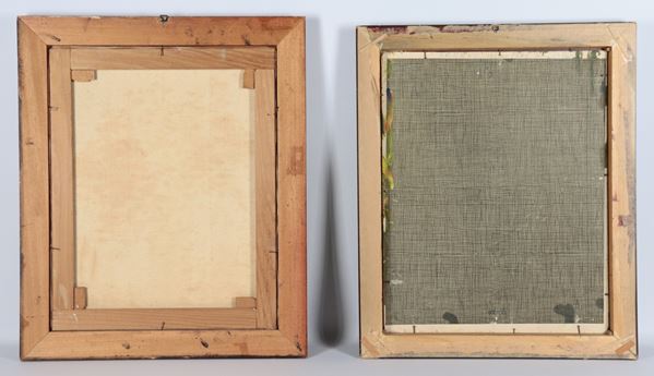 "Vasi con fiori", coppia di piccoli dipinti ad olio su tela in cornici in legno dorato e argentato