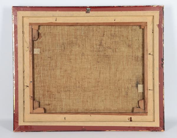 "Vaso con mazzo di fiori", dipinto ad olio su tela in cornice in legno patinato