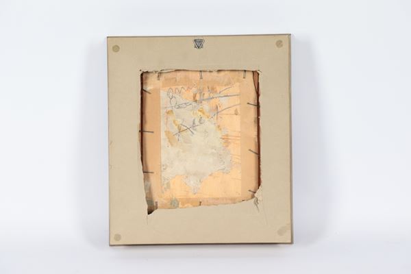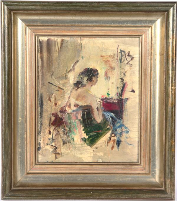 "Ragazza alla toletta", piccolo bozzetto dipinto ad olio su tavoletta in cornice in legno argentato