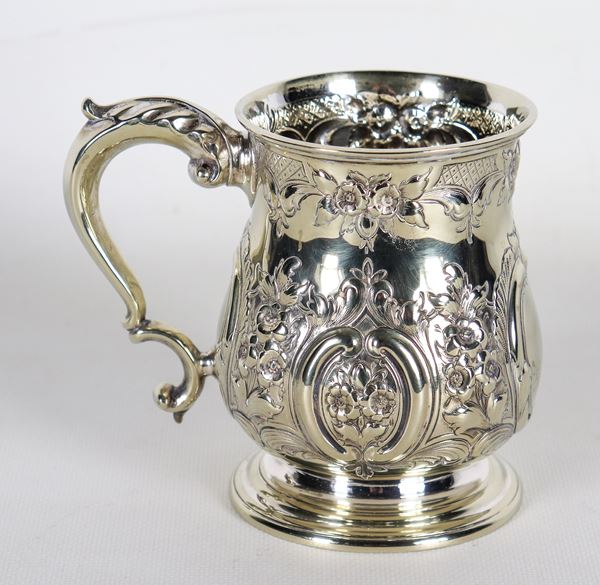 Antico boccale inglese in sheffield, interamente cesellato e sbalzato a volute, fiori e rosoni. Metà XIX Secolo