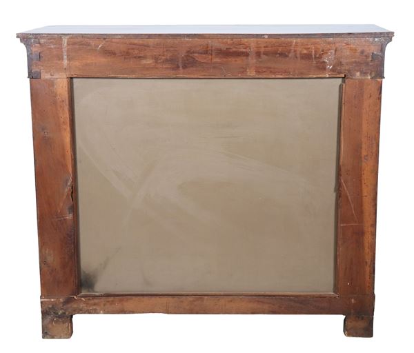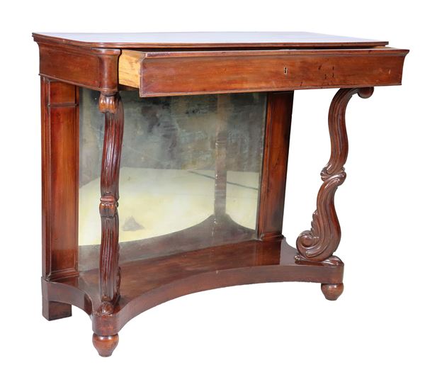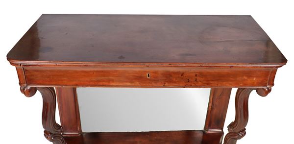 Consolle toscana Impero in mogano, a forma rettangolare con tiretto centrale, due gambe sagomate e due gambe posteriori a colonna rettangolare [..]