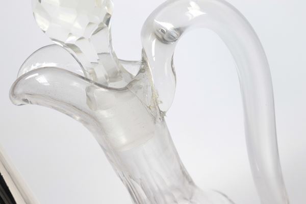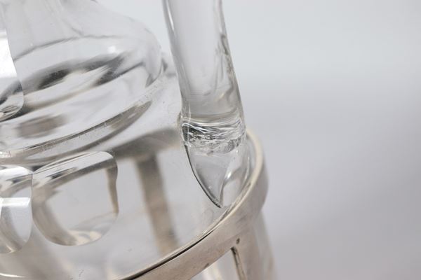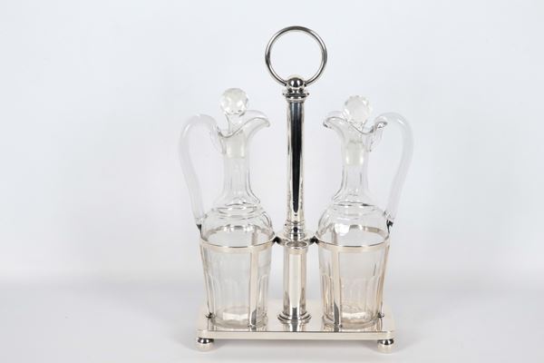Oliera in metallo argentato di linea Impero, con 2 ampolle in cristallo, di cui una con il manico rincollato