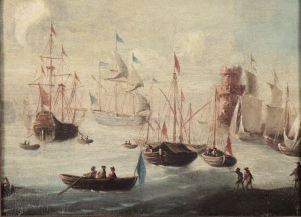 "Marina con porto e velieri", piccolo dipinto ad olio su tela in cornice in legno decapè