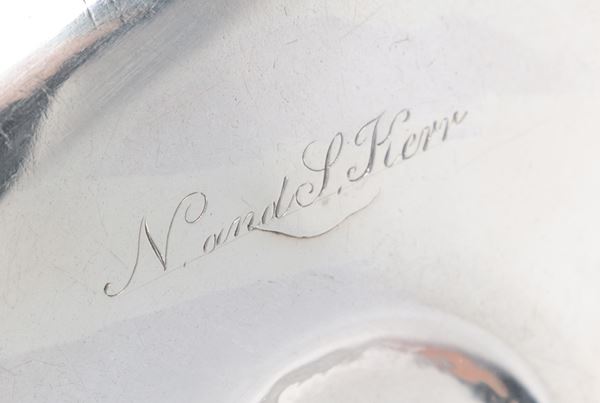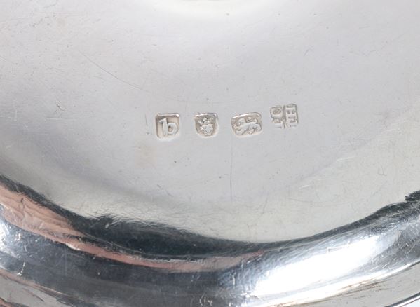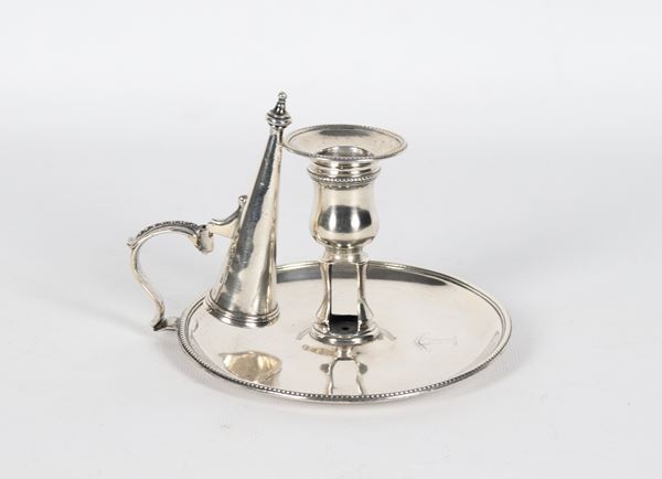Antica bugia inglese Epoca Giorgio II, in argento cesellato e sbalzato, gr. 258. Bolli Londra 1737