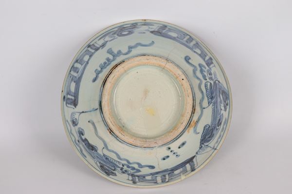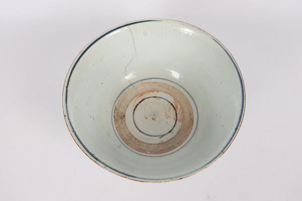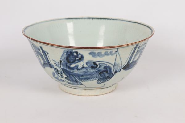 Antica ciotola cinese in porcellana con decorazioni in blu a motivi orientali, difetti e rottura. Inizio XIX Secolo