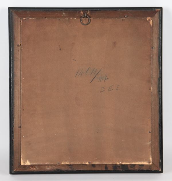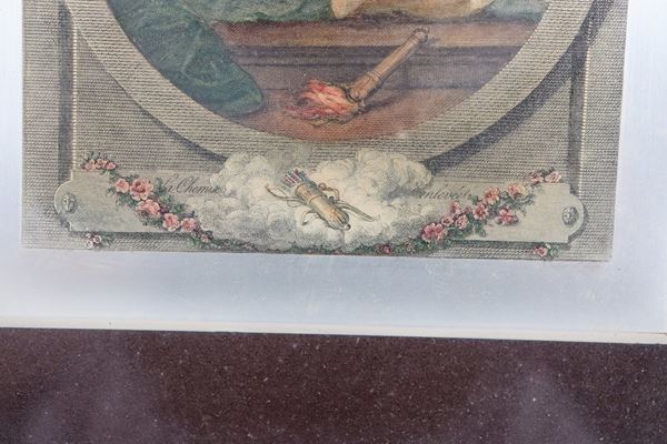 Antica incisione francese a colori su lastra argentata "Venere e Cupido", in antica cornice ebanizzata
