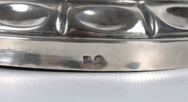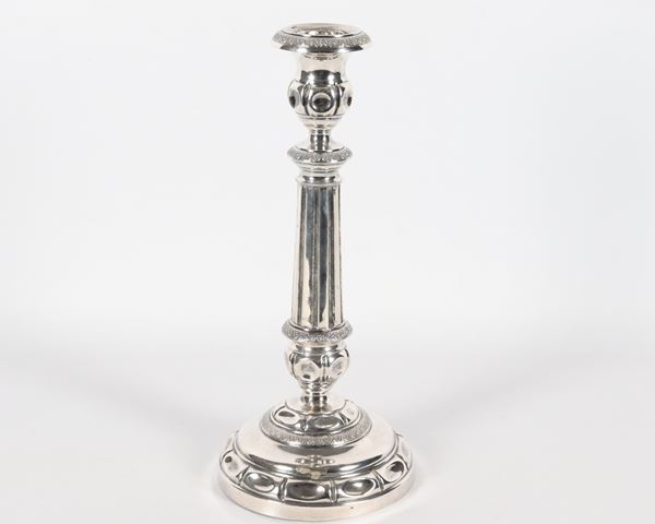 Antico candeliere in argento cesellato e sbalzato a motivi Impero. Bolli Francia, gr. 230