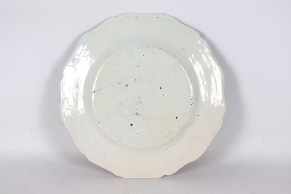 Antico piatto in maiolica Milano interamente decorato a rilievo a volute floreai, palma e pappagallo