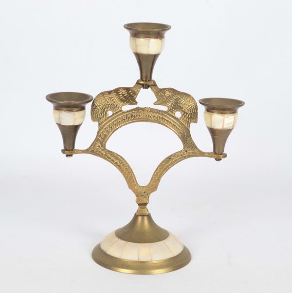 Candelabro indiano in bronzo dorato con piccole sculture di elefanti, 3 fiamme