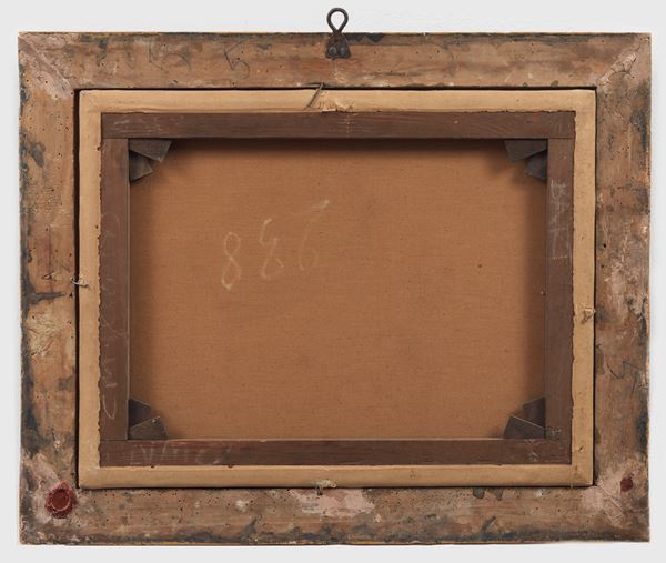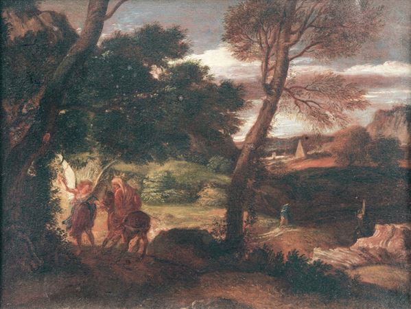 Allievo di. "Paesaggio con Giacobbe e l'Angelo", dipinto ad olio su tela in antica cornice in legno dorato e intagliato