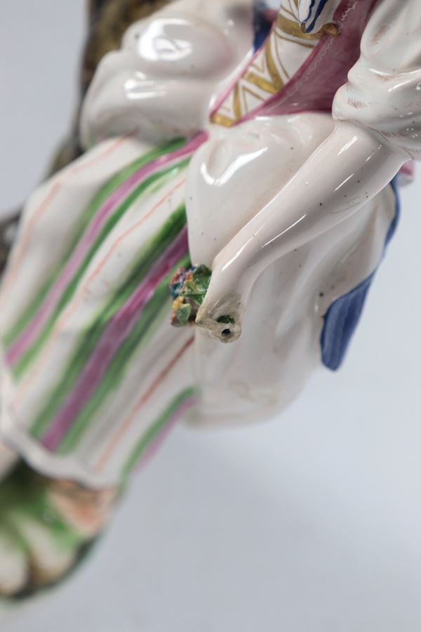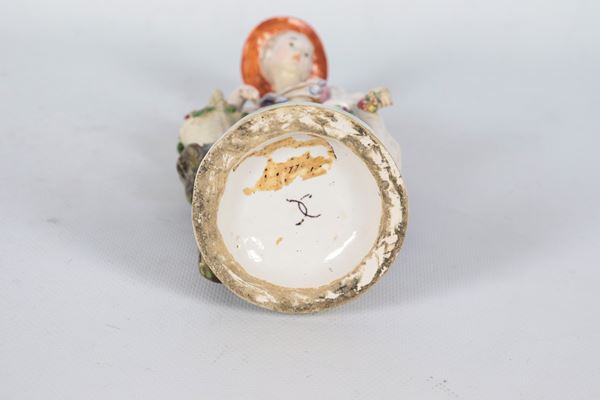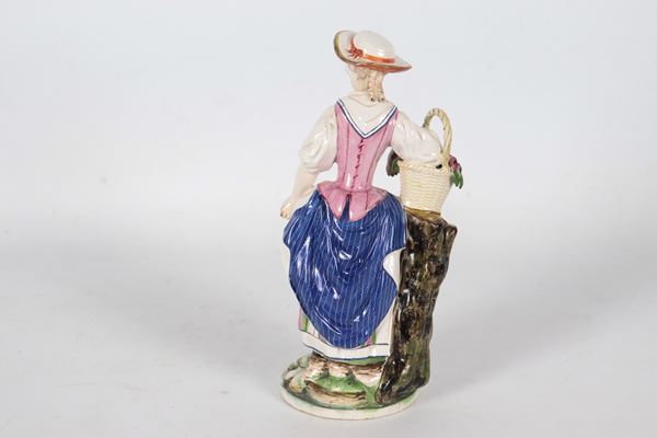 "Contadina con cesto di rose", antica statuina in porcellana policroma di Niederwiller, lievi mancanze. XIX Secolo