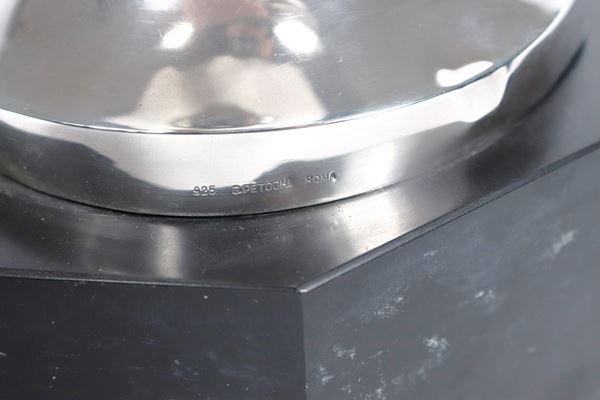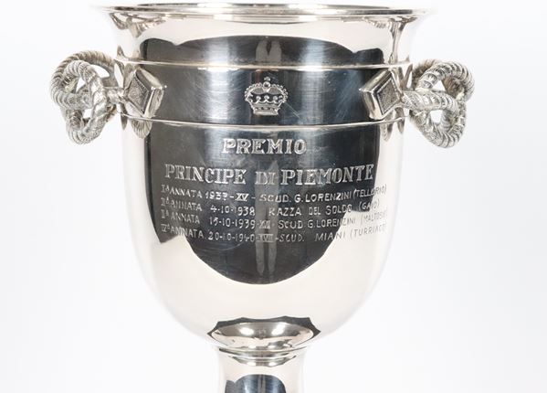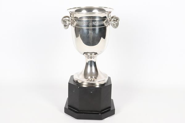 Coppa da trofeo in argento Titolo 925, con manici a nodo Savoia e base ottagonale in marmo nero del Belgio. Manifattura Petochi Roma Anni '30-'40, [..]