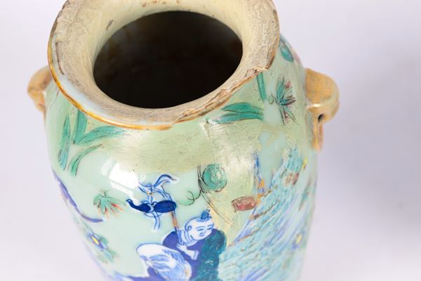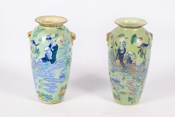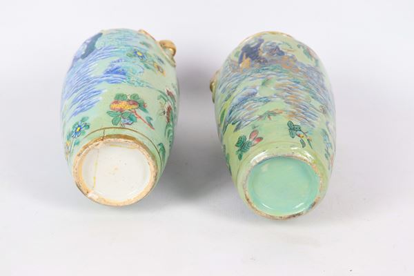 Coppia di antichi piccoli vasi cinesi in porcellana, interamente decorati con smalti policromi a rilievo a motivi di uccelli esotici, farfalle [..]