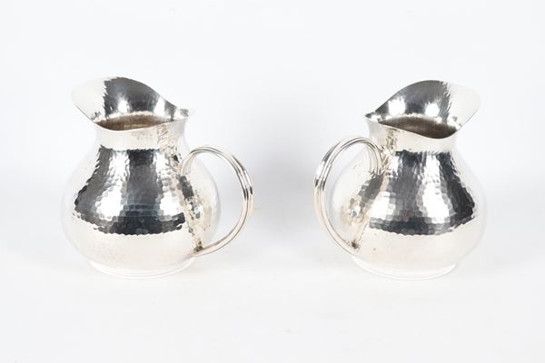 Coppia di caraffe in metallo argentato e martellato, marcate Porciani-Italy. Anni '70-'80