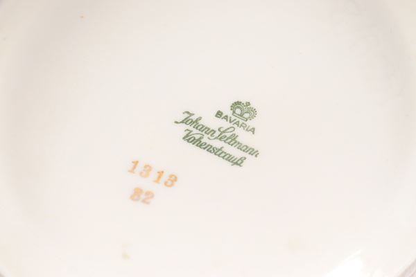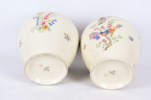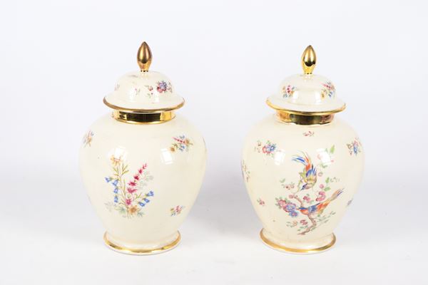 Coppia di potiches in porcellana tedesca di Bavaria, con decorazioni policrome dipinte a rilievo a motivi di fiori e uccelli esotici