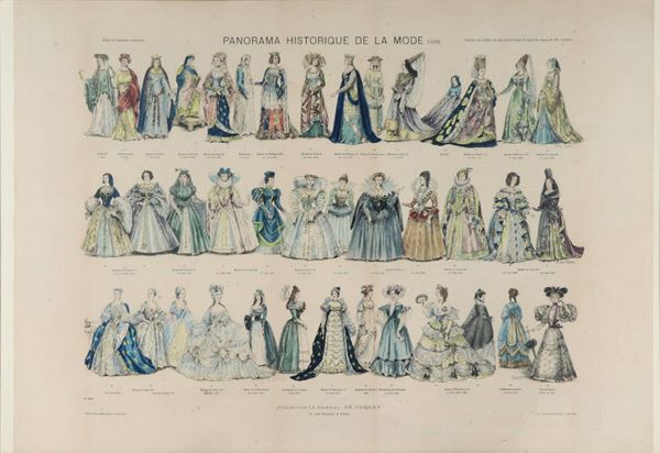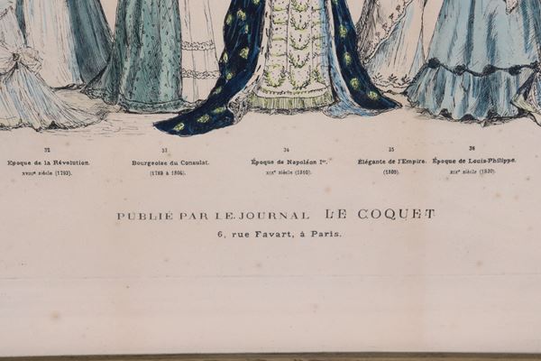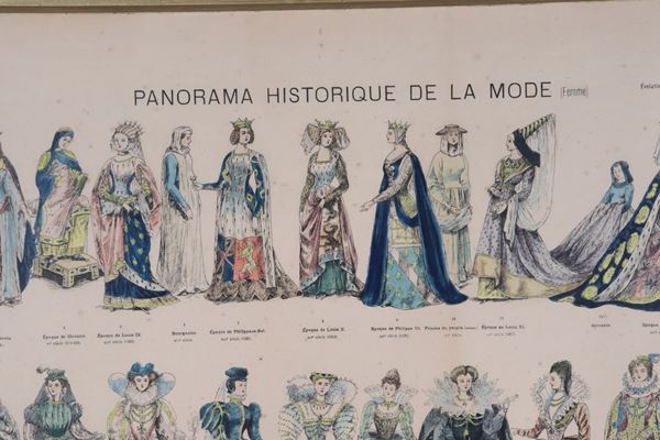 Grande stampa francese a colori "Panorama historique de la mode", cornice in legno dorato