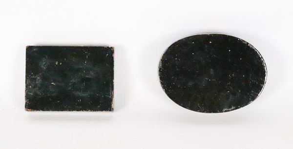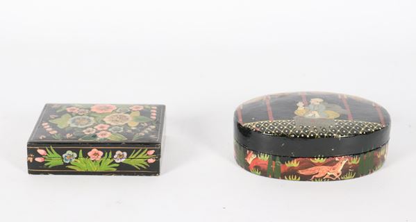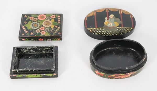 Lotto di due scatole indiane in legno laccato nero, con decorazioni a rilievo di personaggio e fiori orientali, una rettangolare e una ovale