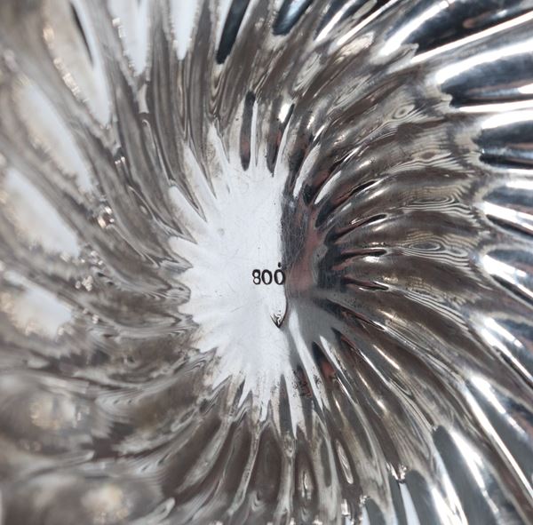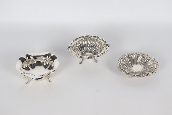 Lotto di tre antiche piccole ciotole in argento a forma ovale, sorrette da piedini ricurvi. Sbalzi e cesellature differenti, gr. 445