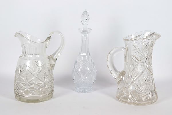 Lotto in cristallo lavorato di due caraffe e una bottiglia da liquore (3 pz.)