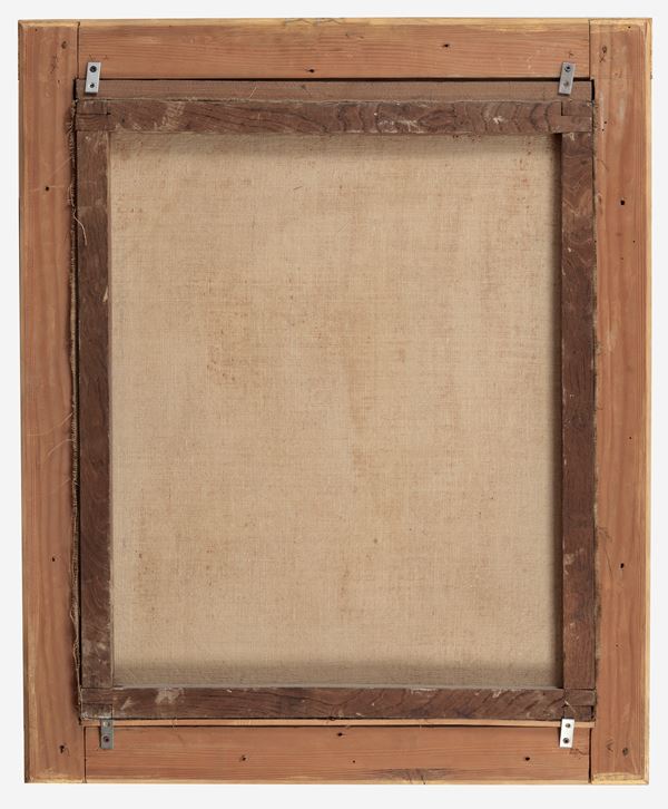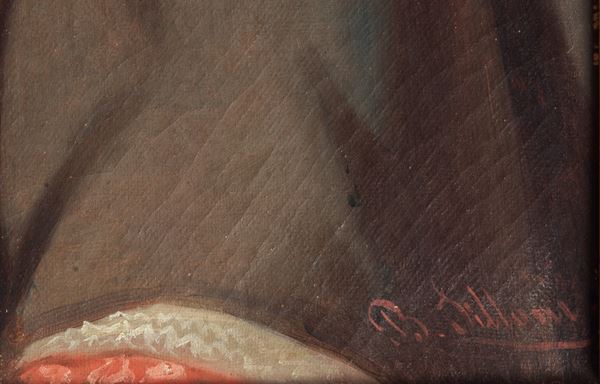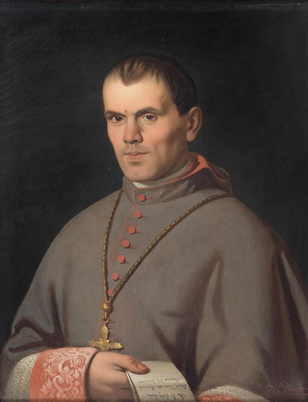 Firmato. "Ritratto di Monsignor Francesco Mazzuoli vescovo di San Severino Marche", dipinto ad olio su tela in antica cornice in legno dorato [..]