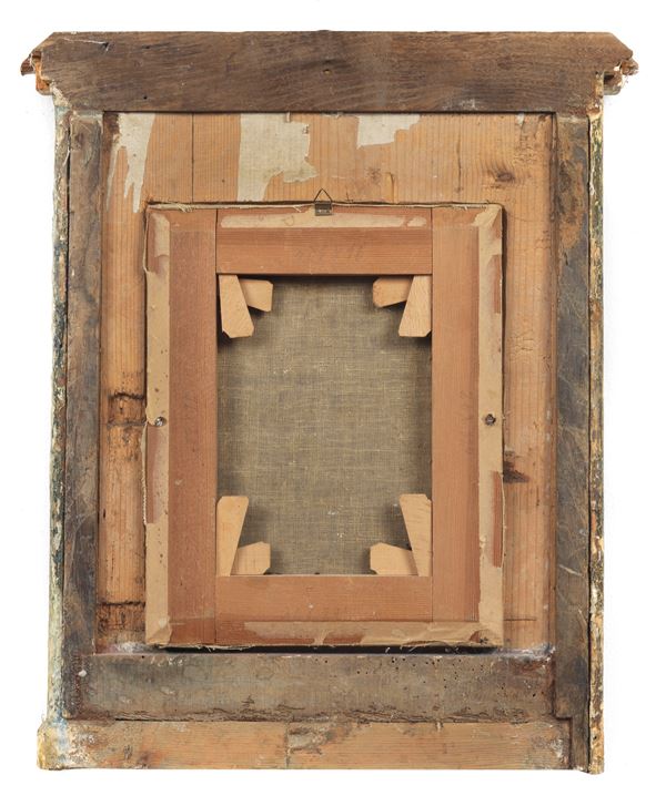 "Cupido", piccolo dipinto ad olio su tela, in cornice a tempietto in legno dorato e laccato con ghirlanda floreale a rilievo