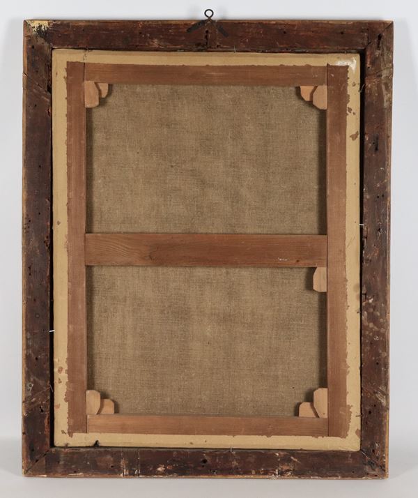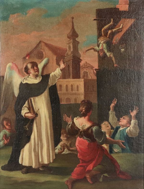 "San Vincenzo Ferrer e il miracolo del muratore", dipinto ad olio su tela in cornice in legno dorato e intagliato