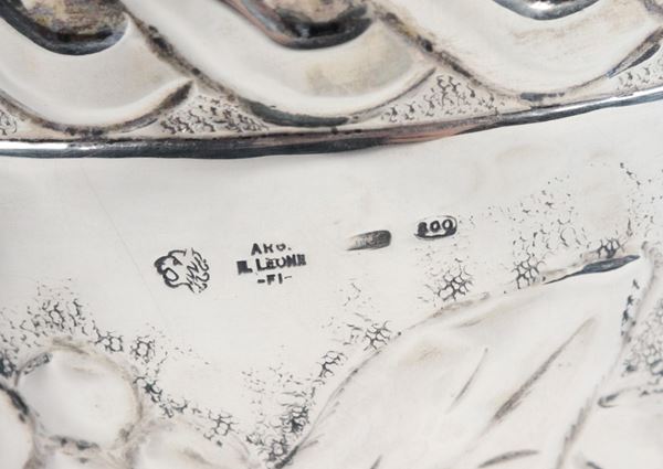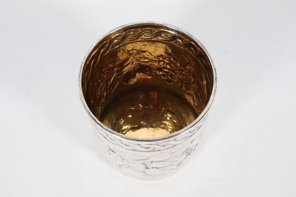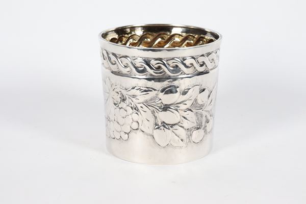 Secchiello portabottiglie in argento martellato, sbalzato e cesellato a motivi di grappoli d'uva, interno in vermeil. Marcato L. Leone - Firenze, [..]