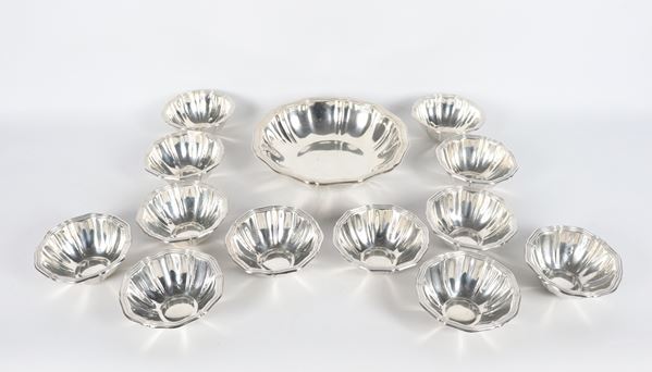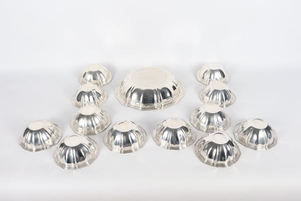 Servizio da gelato in metallo argentato, sbalzato e cesellato: una coppa grande da portata e dodici coppette (13 pz.)
