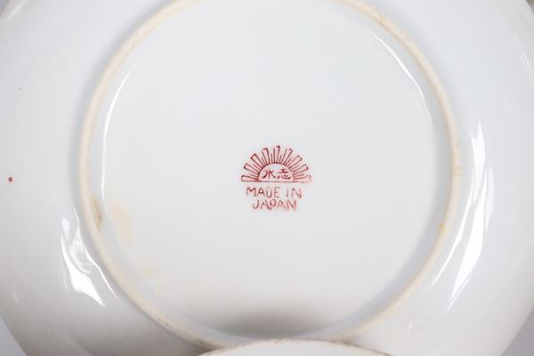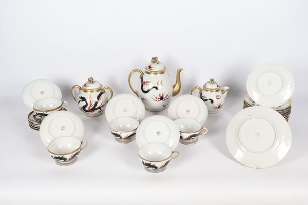 Servizio da tè giapponese in porcellana bianca con decorazioni di draghi: teiera, lattiera, zuccheriera, cinque tazze con piattini, piatto da [..]