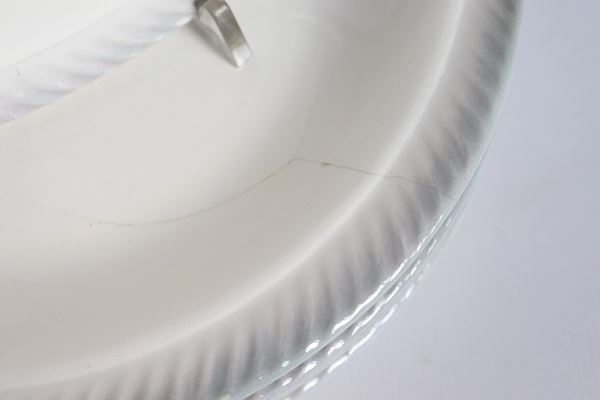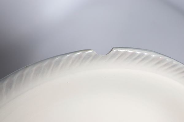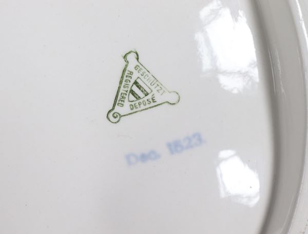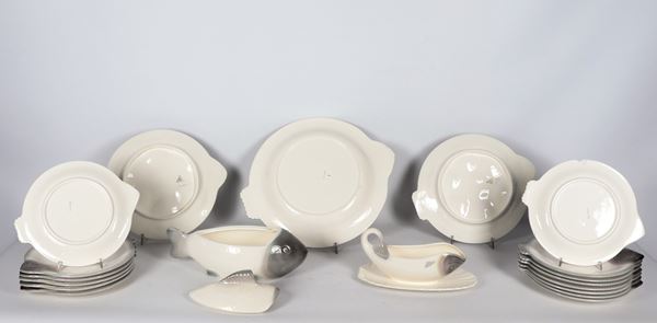 composto da: 14 piatti piani di cui 1 sbeccato e 1 incrinato, una piccola zuppiera a forma di pesce, due piatti da portata per ostriche, una salsiera e un piatto tondo da portata.