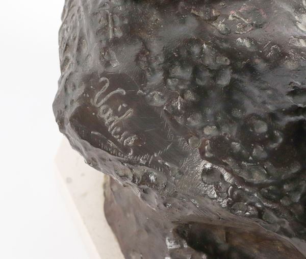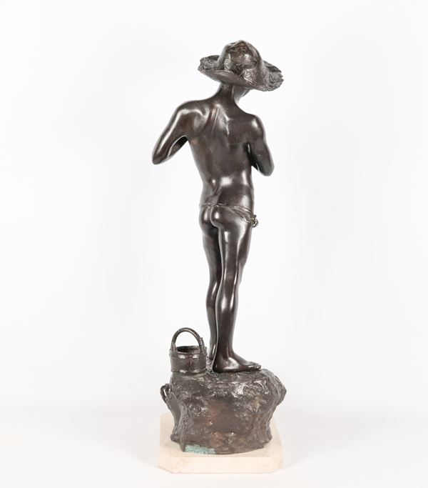 Firmata. "Pescatorello", grande scultura in bronzo di ottima fattura, sorretta da base ottagonale in marmo bianco