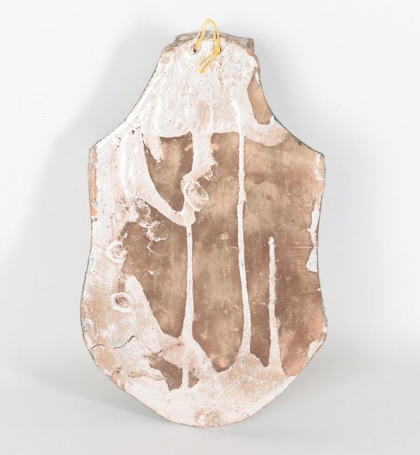 Acquasantiera in maiolica policroma di Ariano Irpino. Lieve mancanza al bordo